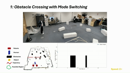 We tackle real-time formation trajectory planning for collaborative object transportation in complex environments using a team of nonholonomic robots and a human.