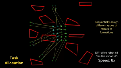 We propose a cooperative multi-formation object transportation system which explicitly handles inter-formation collisions.